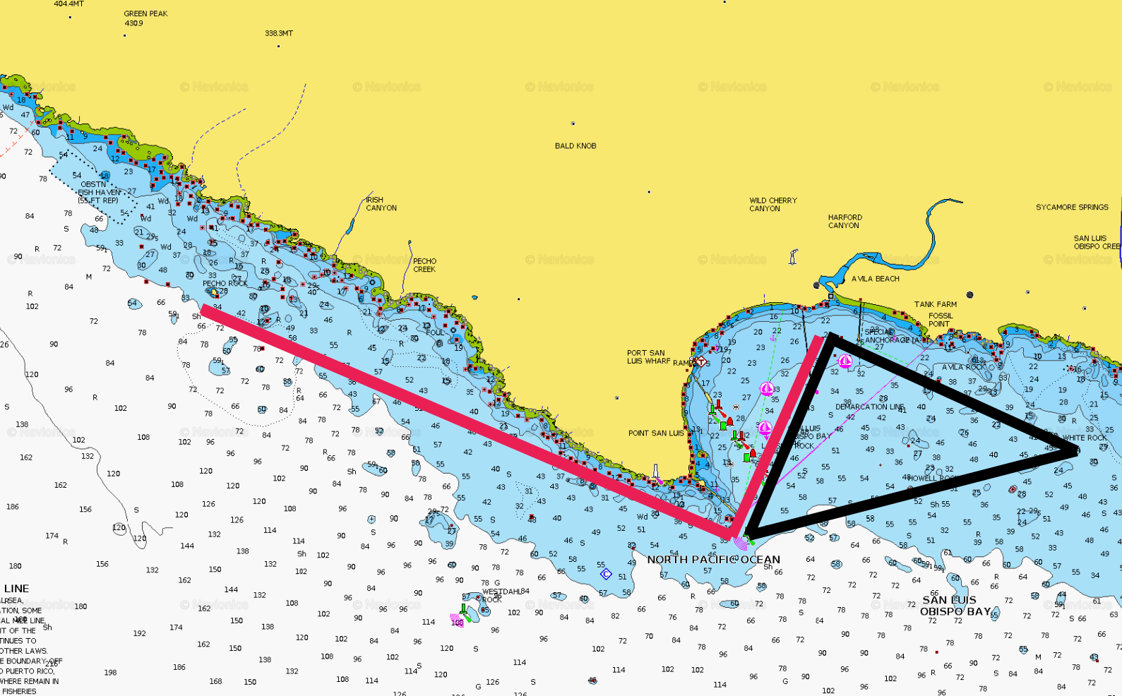 | Short Course (about 6 miles) | Avila Beach southwest to green can #3 (just outside the breakwater); left turn around green can #3; east to White Rock; left turn around White Rock; then northwest back to Avila Beach. |